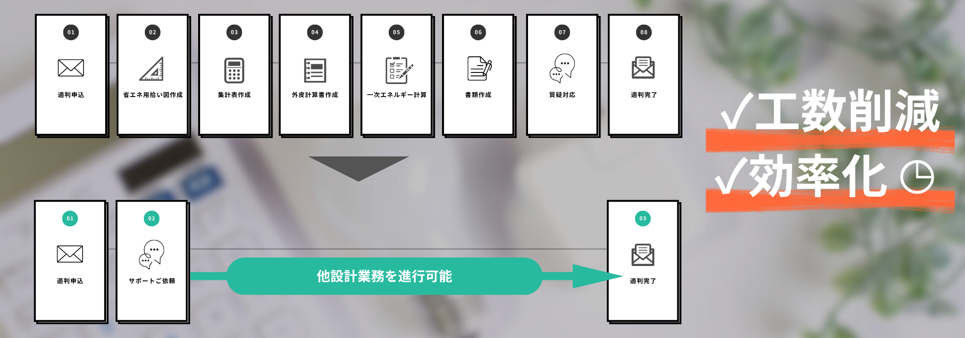 当サービスでは、省エネルギー計算および各種申請業務を専門に、 設計者様・事業者様の業務負担を軽減するサポート業務を行っております。